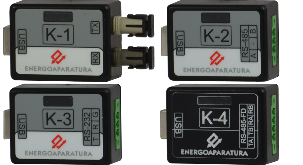 ZastosowanieKonwertery K-1, K-2, K-3, K-4 to przejściówki pomiędzy standardem USB a złączem światłowodowym, RS232, RS485HD i RS485FD. Moduły te realizują warstwę fizyczną oraz warstwę aplikacji zrealizowaną w oparciu o układ FTDI. Podstawowym zastosowaniem konwerterów jest serwis urządzeń poprzez łącza światłowodowe, RS232 oraz RS485. Konwertery umożliwiają podłączenie komputera do portów urządzeń, co pozwala na przenoszenie informacji (dwukierunkowo) na duże odległości.