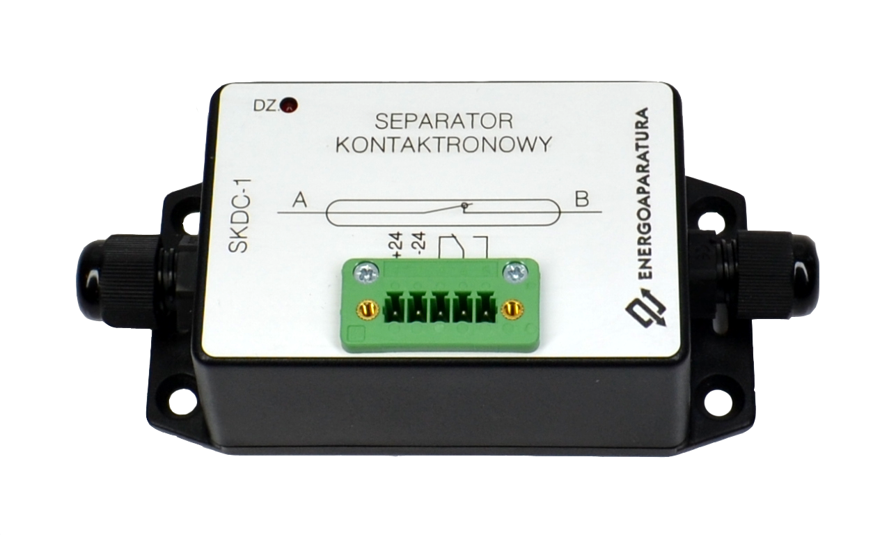 Urządzenie SKDC-1 – Separator kontaktronowy stosowany jest do odłączania szyny zasilającej od izolatora pomiarowego oraz przekaźnika blokady uziemnika. Podczas prób pola rozdzielnicy na doziemienie zachodzi konieczność rozłączenia układu pomiarowego ponieważ izolator pomiarowy IPDC-1 oraz przekaźnik PBDC-1 mają wewnętrzną rezystancję pomiędzy szyn