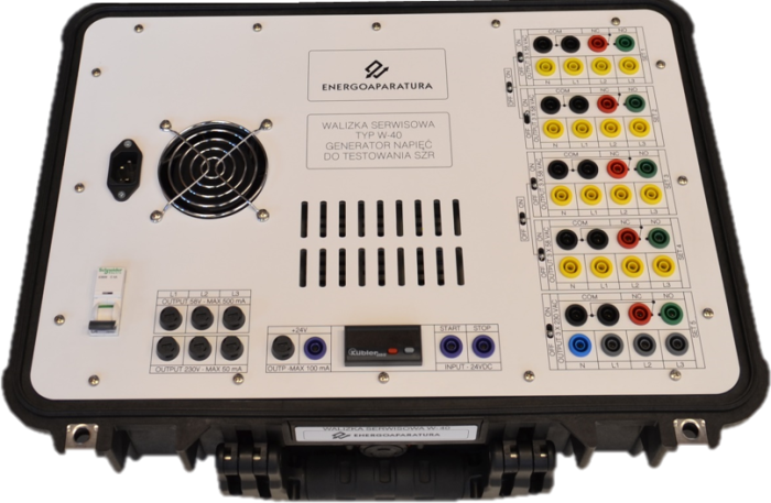 Walizka serwisowa typu W-40 została zaprojektowana i wyprodukowana na potrzeby badania automatyki samoczynnego załączania rezerwy zasilania. Przeznaczona jest przede wszystkim do podawania napięcia pomiarowego do zabezpieczeń, symulując działanie i obecność przekładników napięciowych. Urządzenie posiada również szerokie zastosowanie w testowaniu obwodów wtórnych zabezpieczeń rozdzielni. Walizka posiada cyfrowy milisekundomierz, służący np. do pomiaru czasu zadziałania zabezpieczeń w funkcji obecności napięcia pomiarowego. Wymiar oraz konstrukcja urządzenia pozwala na pracę zarówno w laboratorium jak i na obiekcie.