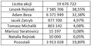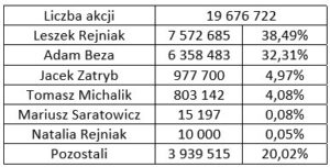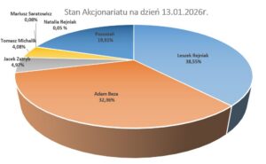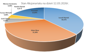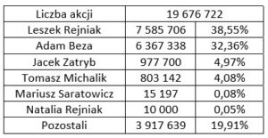 Dane dotyczące struktury akcjonariatu przedstawiono na podstawie informacji otrzymanych przez spółkę w trybie art. 69 ust. 1 ustawy o ofercie publicznej i warunkach wprowadzania instrumentów finansowych do zorganizowanego systemu obrotu oraz o spółkach publicznych oraz w trybie art. 19 Rozporządzenia Parlamentu Europejskiego i Rady (UE) nr 596/2014 (Rozporządzenie MAR).